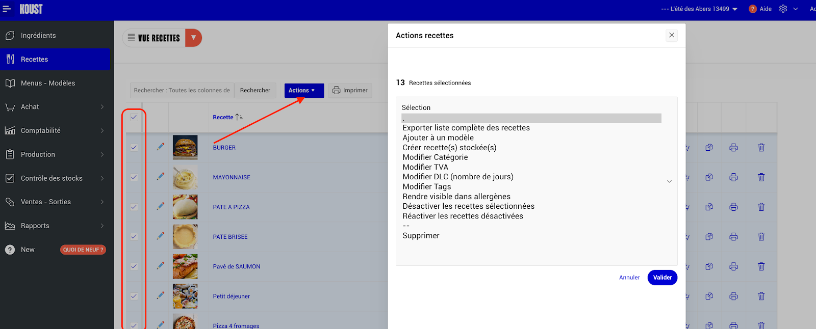 - Sélectionnez les recettes concernées