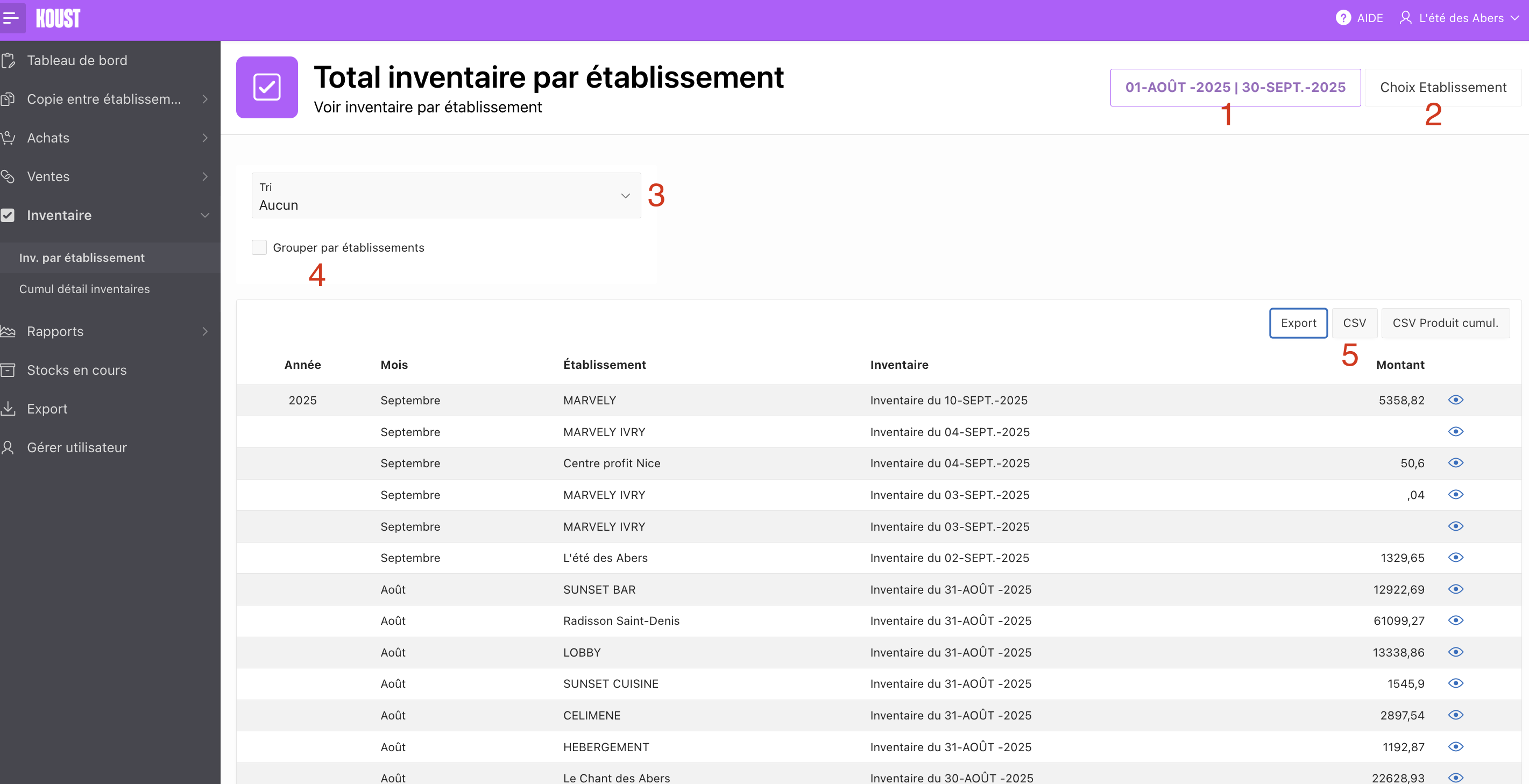 Ce module regroupe les inventaires réalisés au sein de vos établissements, vous pouvez alors analyser et contrôler les valorisations de vos inventaires.